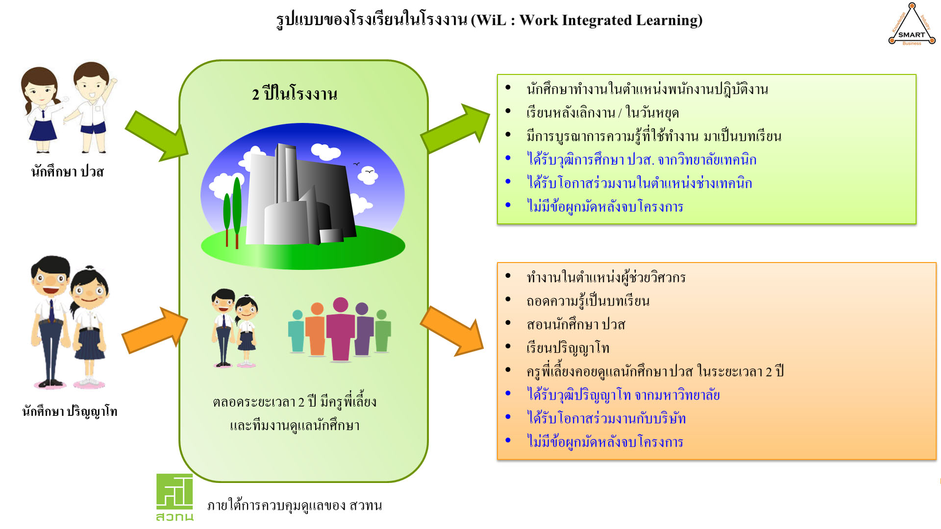 WiL โรงเรียนในโรงงาน (Work-Integrated Learning) : โครงการบูรณาการการเรียนรู้กับการทำงาน (Work-integrated Learning: WiL) ในรูปแบบ โรงเรียนในโรงงาน โดยเป็นโครงการที่เกิดจากความร่วมมือระหว่าง ภาครัฐ , ภาคการศึกษา , ภาคเอกชน โดยมีเป้าหมายในการสร้างความเข้มแข็งของสังคม ชุมชน และท้องถิ่นให้เป็นรากฐานที่มั่นคงของประเทศ ด้วยการพัฒนาระบบการศึกษาให้เหมาะสมกับความต้องการของภาดอุตสาหกรรมและพัฒนากำลังคนผ่านระบบ “โรงเรียนในโรงงาน” และเพื่อแก้ปัญหาความไม่สอดคล้องทางด้านความรู้ความสามารถระหว่างภาคอุตสาหกรรมและภาคการศึกษา
